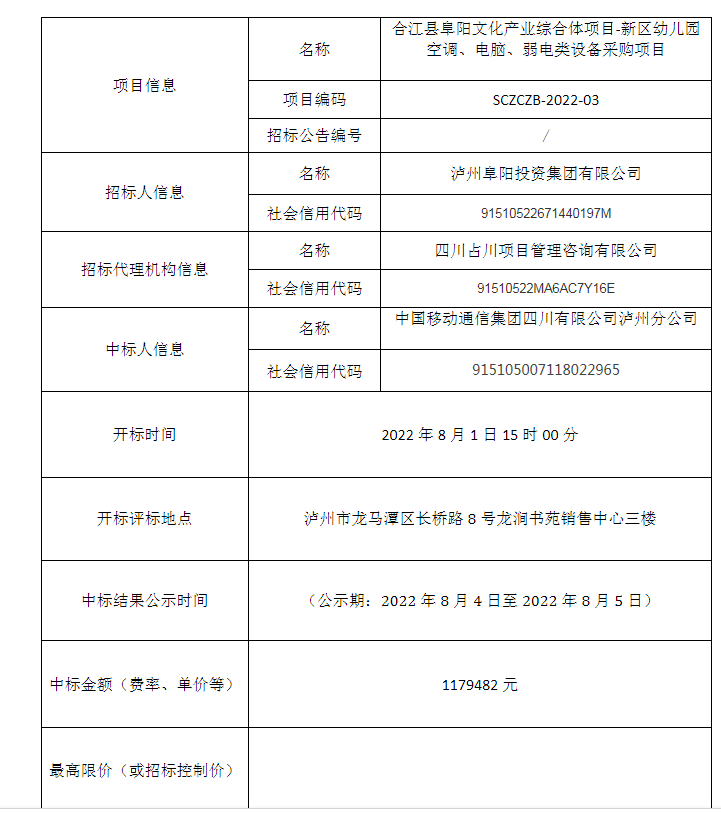 合江縣阜陽文化產(chǎn)業(yè)綜合體項目-新區(qū)幼兒園空調(diào)、電腦、弱電類設(shè)備采購項目公開招標中標結(jié)果公告