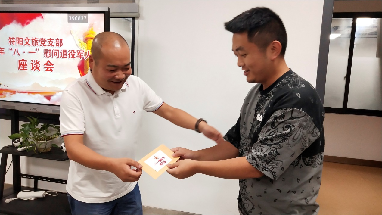 為扎實(shí)做好擁軍優(yōu)屬 、 擁政愛(ài)民工作 , 在 “ 八 一 ” 建軍節(jié)來(lái)臨之際, 符陽(yáng)文旅黨支部開(kāi)展 “ 八一 ” 慰問(wèn)活動(dòng), 組織文旅 公司工作的退役軍人召開(kāi)座談會(huì), 了解他們的工作和生活情 況, 為他們送上慰問(wèn)金, 并致以節(jié)日的祝福。 退役軍人表示 感受到公司的關(guān)懷和愛(ài)心,在今后的工作中發(fā)揮軍人本色, 為公司發(fā)展貢獻(xiàn)力量。