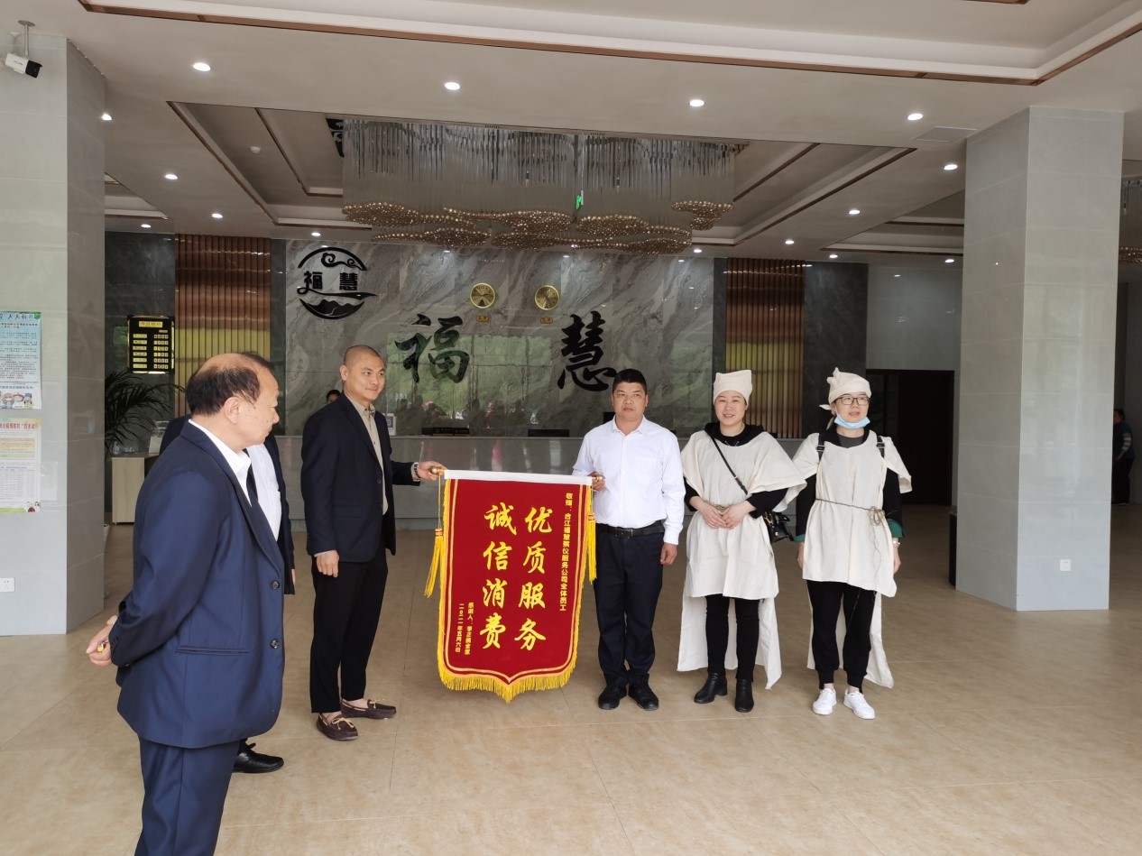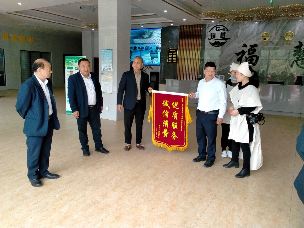 5月6日,家屬李正攜全家走進(jìn)合江縣?;蹥浽岱?wù)有限公司,將一面“誠信消費(fèi)優(yōu)質(zhì)服務(wù)”的錦旗送到殯儀服務(wù)中心工作人員的手中。